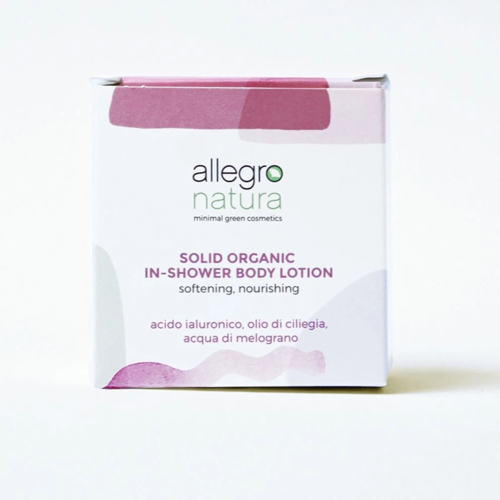 INGREDIENTI:oryza sativa starch, cetearyl alcohol, theobroma cacao seed butter, butyrospermum parkii butter*, oryza sativa cera, hydrogenated olive oil, sodium cocoyl isethionate, cellulose, prunus amygdalus dulcis oil*, cocos nucifera oil*, prunus avium seed oil, glyceryl caprylate/caprate, olea europaea fruit oil, fragrance**, olea europaea oil unsaponifiables, punica granatum fruit water*, tocopheryl acetate, sodium hyaluronate, vaccinium myrtillus leaf water*, iron oxides (and) mica. *da agricoltura biologica**da essenze conformi al disciplinare AIAB