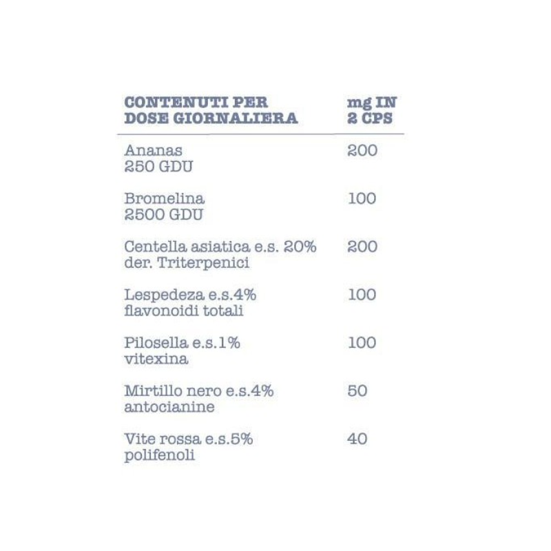 Ingredienti: Ananas gambo (Ananas comosus (L.) Merr.) polvere 250 GDU, Centella asiatica parti aeree (Centella asiatica (L.) Urb.) estratto secco al 20% derivati triterpenici, agente di rivestimento: capsula vegetale in idrossipropilmetilcellulosa; Bromelina 2500 GDU, Lespedeza parti aeree (Lespedeza capitata Michx.) estratto secco al 4% in flavonoidi totali espressi come rutina, Pilosellaparti aeree (Hieracium pilosella L.) estratto secco al 1% vitexina, mirtillo nero frutti (Vaccinium myrtillus L.) estratto secco al 4% antocianine, vite rossa foglie (Vitis vinifera L.) estratto secco al 5% polifenoli, agenti antiagglomeranti: sali di magnesio degli acidi grassi e biossido di silicio