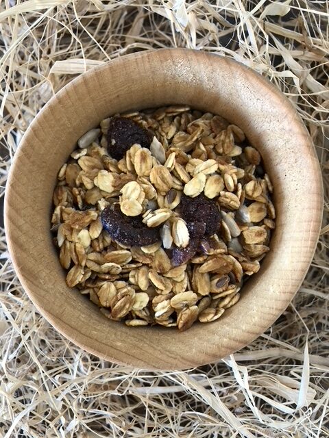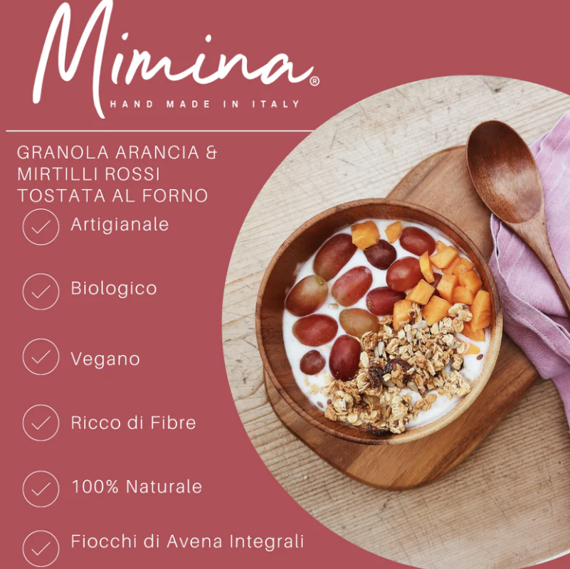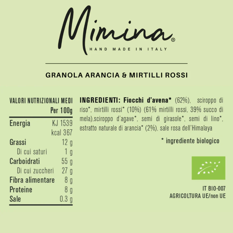 INGREDIENTI:Fiocchi d’avena* (45%), sciroppo d’agave*, sciroppo di riso*, mirtilli rossi* (10%) (mirtilli rossi 64%, succo di mela concentrato 39%), semi di lino*, semi di girasole*, estratto naturale di arancia* (2%), sale rosa dell’Himalaya.