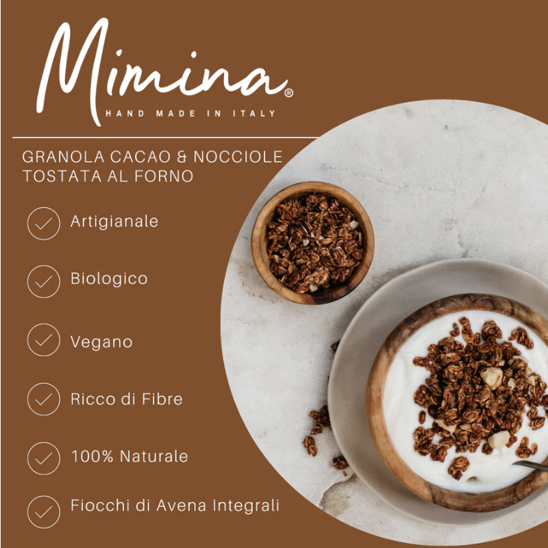 La granola Mimina è artigianale, vegana, biologica, senza zuccheri raffinati aggiunti. Le ricette ed il sapore delle granole è unico in quanto la lavorazione prevede una cottura in forno svolta interamente a mano ed una ricetta che è stata studiata per donare un lento rilascio di energia.