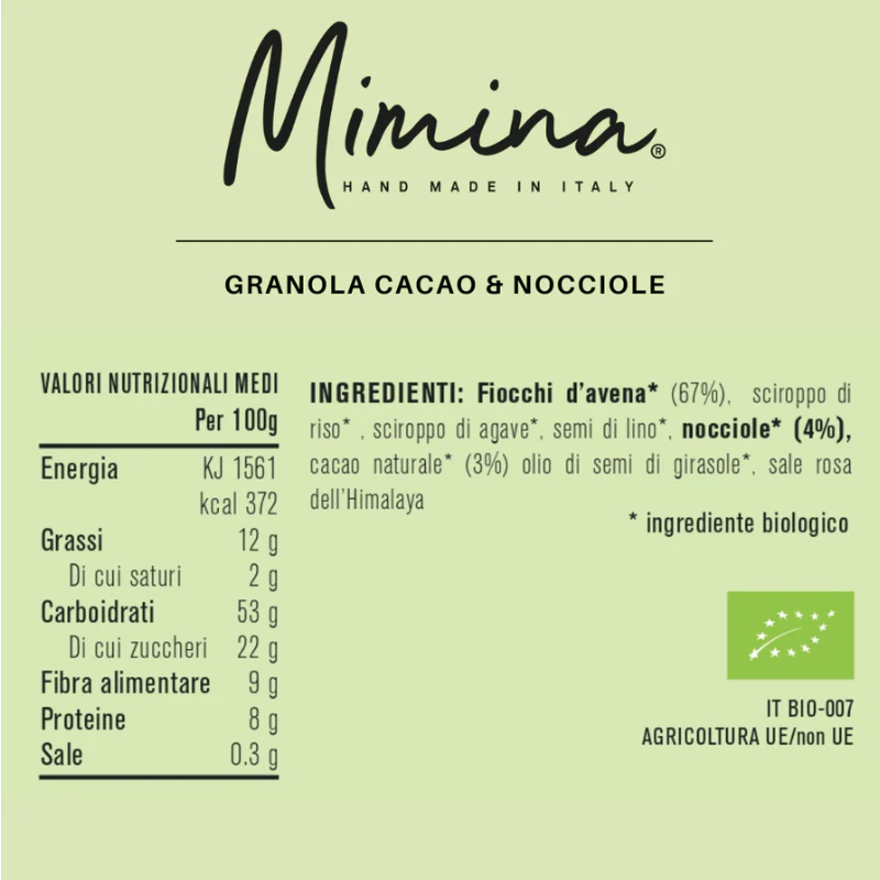 Fiocchi d’avena* (52%), sciroppo d’agave*, sciroppo di riso*, nocciole* (3%), cacao* (3%), semi di lino*, sale rosa dell’Himalaya * ingrediente biologico