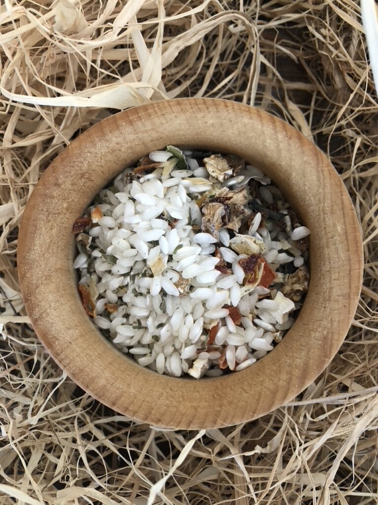 Ingredienti: riso carnaroli, pomodoro, peperone, melanzane, zucchine, sedano, carota, cipolla, prezzemolo e basilico.