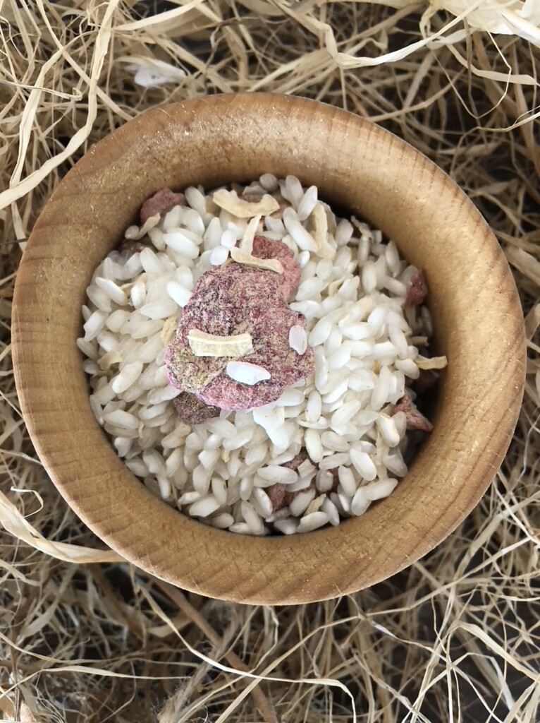 Ingredienti:riso carnaroli,limone liofilizzato, fragola liofilizzato e cipolla.