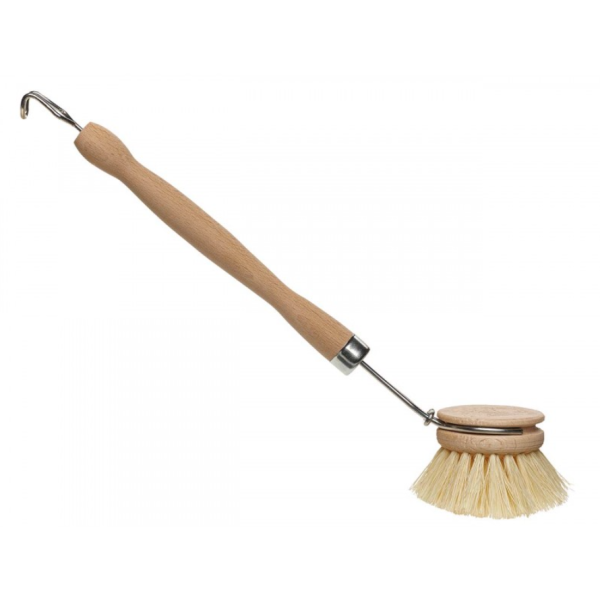 Una spazzola per piatti senza plastica, con setole a base vegetale. La testina è rimovibile e sostituibile .