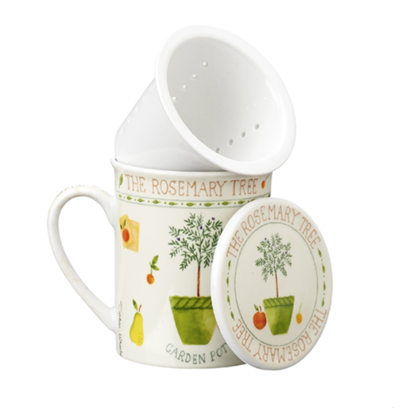 Tisaniera con filtro in porcellana e motivo campagnolo.